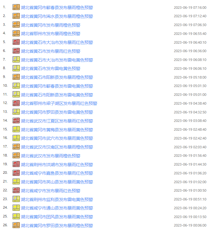 据湖北气象局最新消息,今日,湖北武汉、黄冈、鄂州、黄石、咸宁、荆州多地发布暴雨预警共26条,出行请注意!