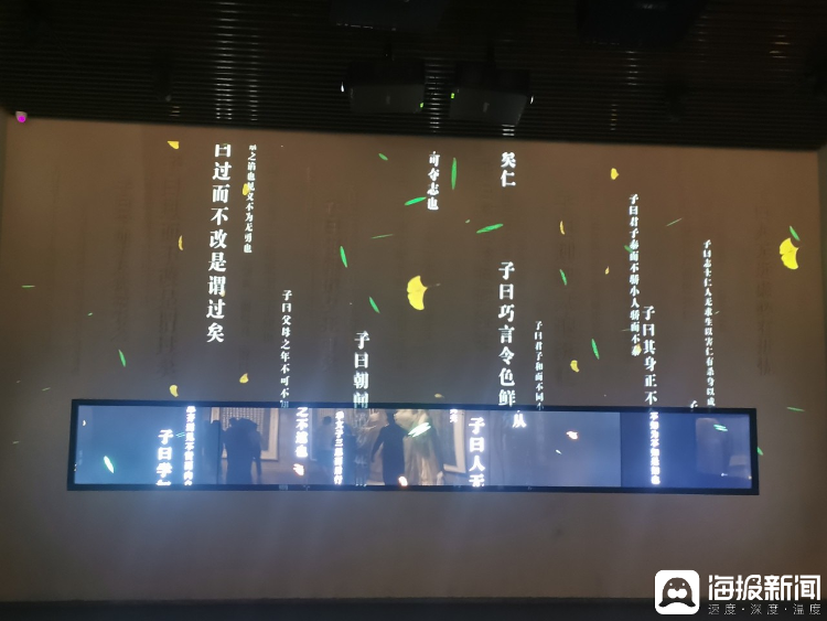 在《论语》瀑布墙,一句句耳熟能详的儒家经典,以光影的形式跃然眼前。在数字化《孔子圣迹图》上,关于孔子的180个经典故事,通过投影与画卷相结合的方式展现了孔子波澜壮阔的一生。
