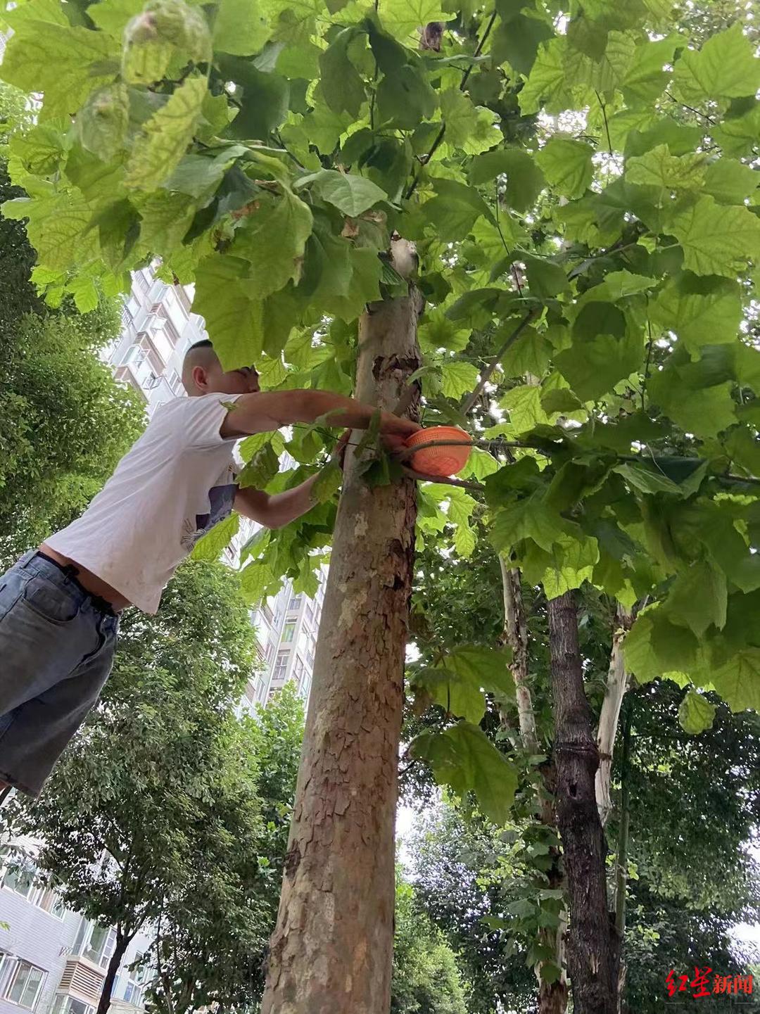 张女士说,鸟巢所在处高度超过8米,无法直接把幼鸟送回巢内。此时,过路的一名女士建议用塑料筐在树梢矮处为小鸟做一个临时鸟巢,再用铁丝固定,方便亲鸟哺育。