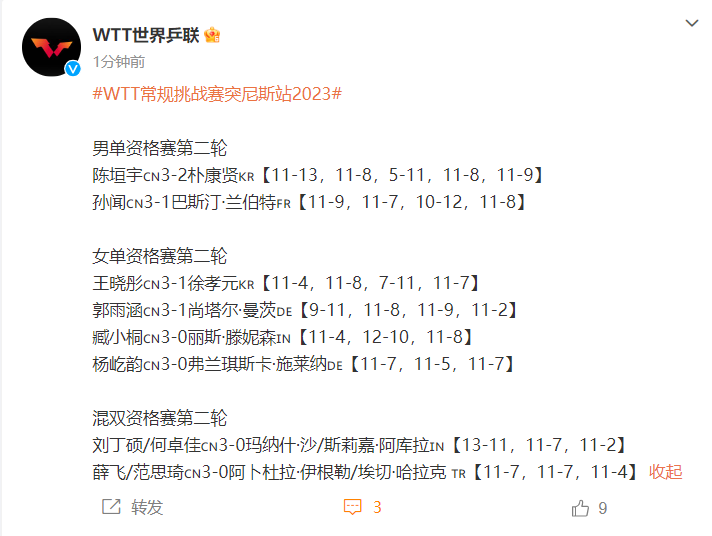 6月21日,据WTT世界乒联消息,WTT常规挑战赛突尼斯站男单、女单、混双资格赛第二轮赛果: