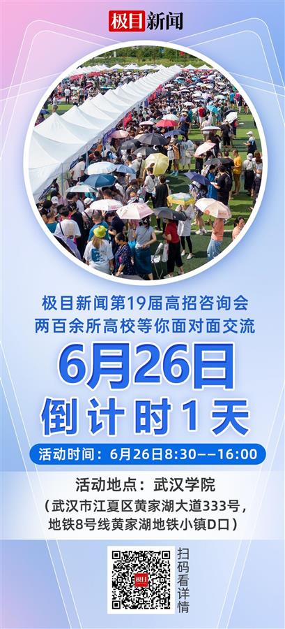 6月26日,极目新闻第十九届高校招生咨询会将于武汉学院举行。届时,将有来自全国200余所高校和国际高教合作与留学机构的招生负责人现场答疑,帮助考生和家长全面高效了解高校招生政策、专业设置、往年录取分数线以及各专业就业方向等相关问题,为考生和家长提供“一站式”咨询服务。