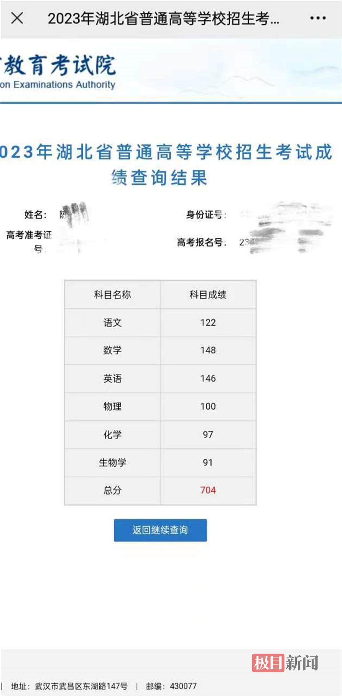 “704分!儿子太棒了!”6月25日凌晨4时50分,武汉市第十一中学高考生陈华宇同学家发出一阵欢呼,语文122、数学148、英语146、物理100、化学97、生物91,总分704!