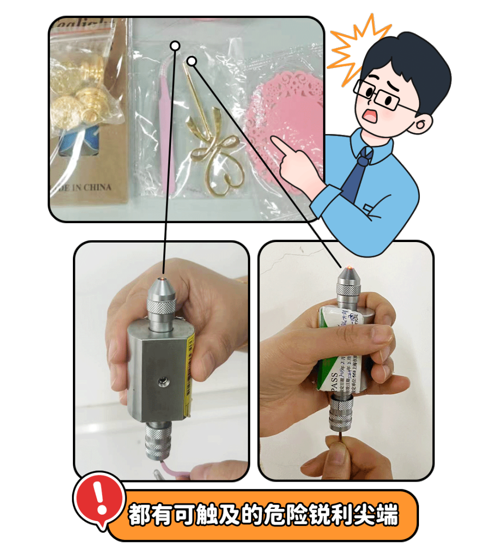 6批次样品中含有镊子、搅拌棒或徽章,存在功能性锐利尖端和可触及锐利尖端,但未设有相关警示说明。儿童使用时,可能会产生刺伤皮肤的危害。