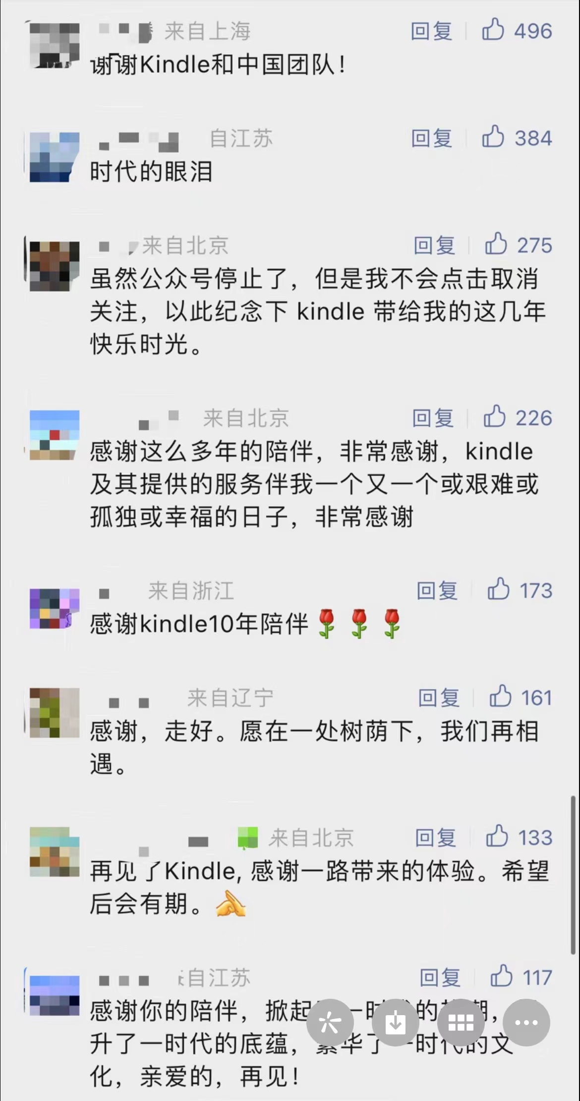 如今,Kindle在中国画上句号,也令不少读者恋恋不舍。6月30日,记者看到许多用户主动前往Kindle服务号官方微信下留言怀念。有读者感慨称“时代的眼泪”;有读者表示感谢Kindle的10年陪伴,希望后会有期;还有的读者十分不舍,认为这是“属于我们的青春记忆”。