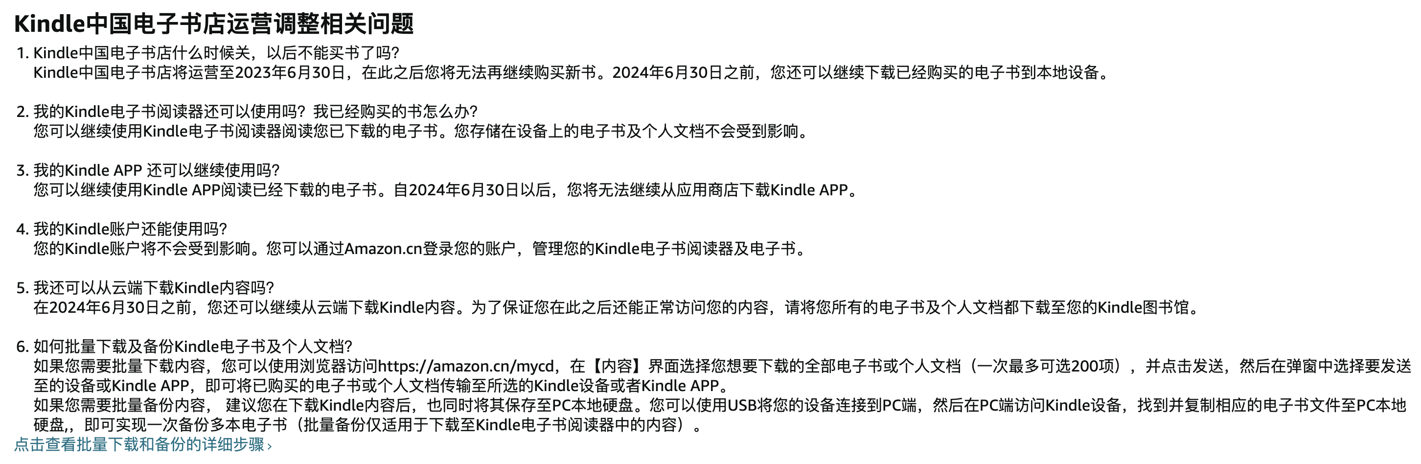 另外,亚马逊还表示,Kindle客户服务将支持至2024年6月30日。用户可以继续使用Kindle电子书阅读器阅读已下载的电子书,存储在设备上的电子书及个人文档不会受到影响。用Kindle APP阅读已经下载的电子书也不受影响,但自2024年6月30日以后,用户将无法继续从应用商店下载Kindle APP。