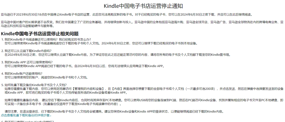 据悉,亚马逊Kindle服务号5月31日发布了“告别手册”,解答了一系列和停止运营有关的问题,并提醒用户在2024年6月30日前,务必下载已购电子书到本地设备或者Kindle图书馆。30日,亚马逊公司旗下Kindle中国电子书店正式停止运营,此后用户无法再购买新的电子书。对于用户此前已购买的电子书,可以在2024年6月30日之前下载,并且可以继续阅读。存储在Kindle设备上的电子书及个人文档不会受到影响。