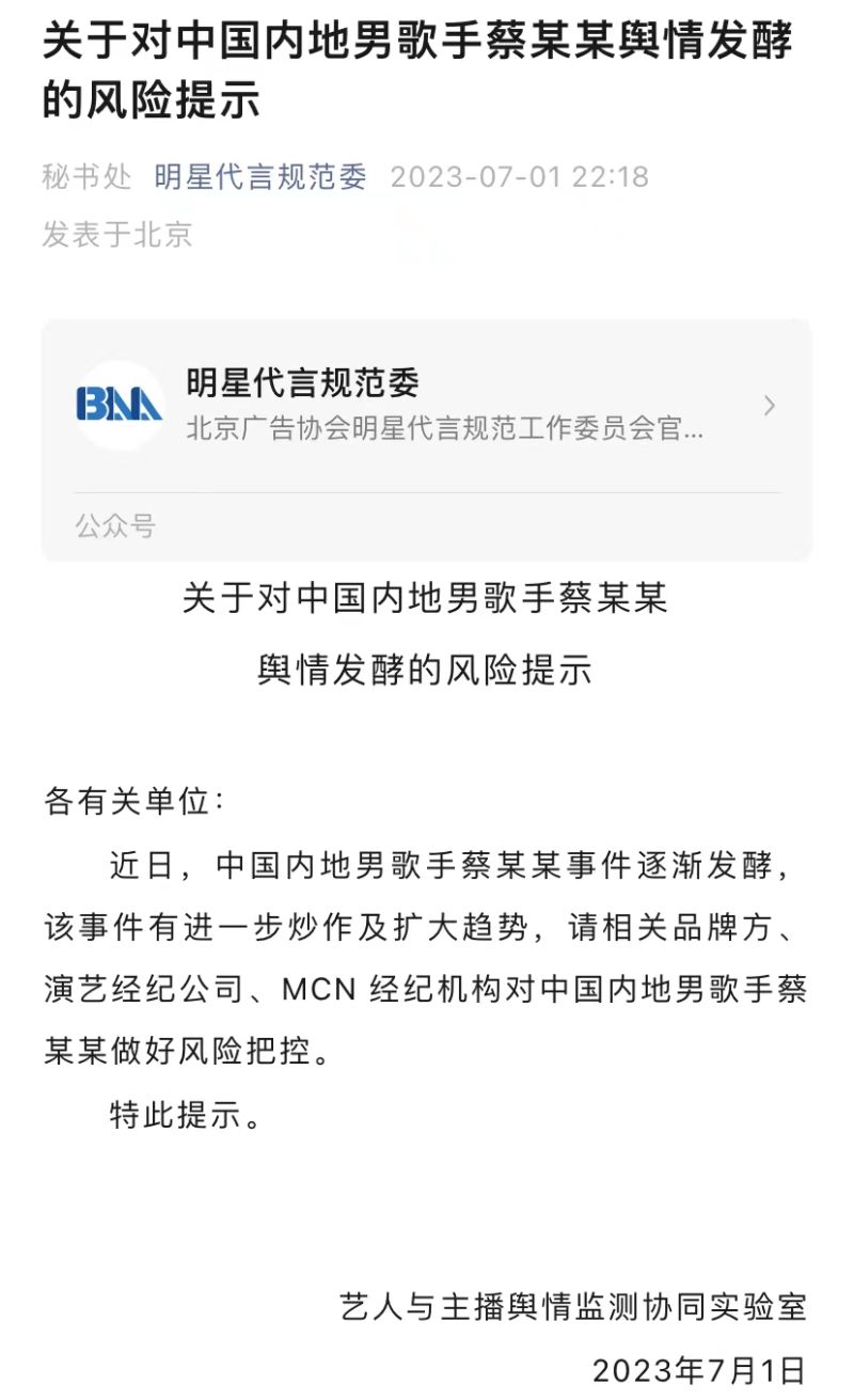 7月1日晚,北京广告协会明星代言规范委发布关于对中国内地男歌手蔡某某舆情发酵的风险提示。以下为全文: