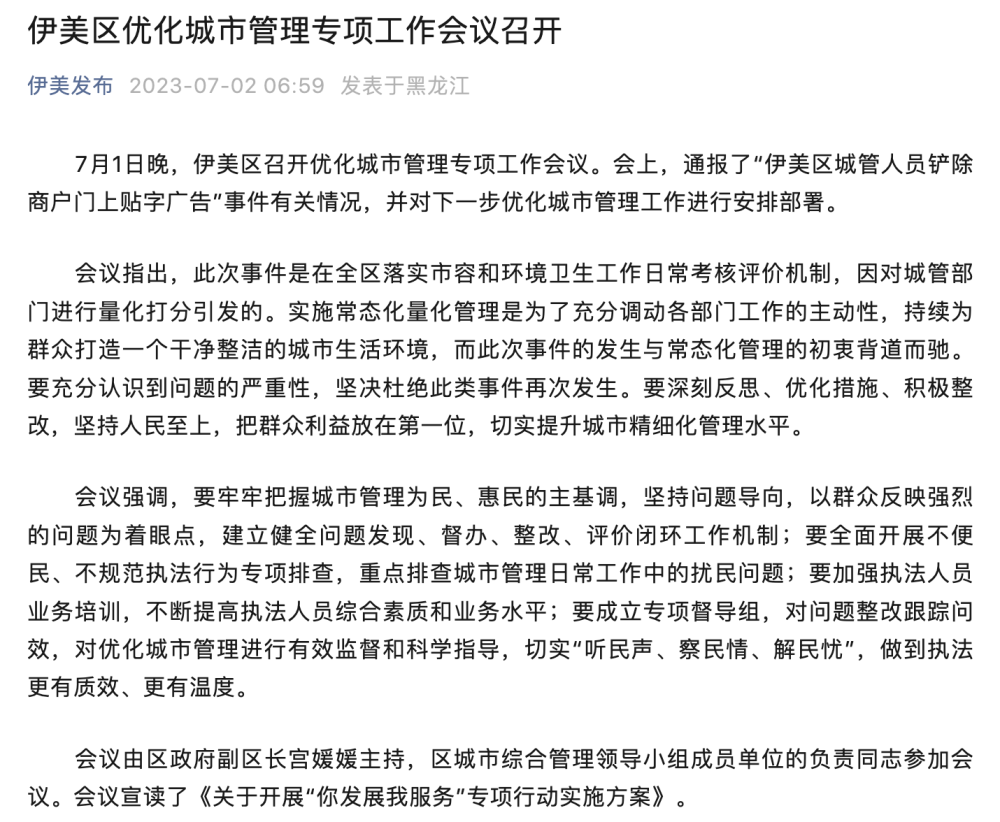7月1日晚,伊美区召开优化城市管理专项工作会议。会上,通报了“伊美区城管人员铲除商户门上贴字广告”事件有关情况,并对下一步优化城市管理工作进行安排部署。