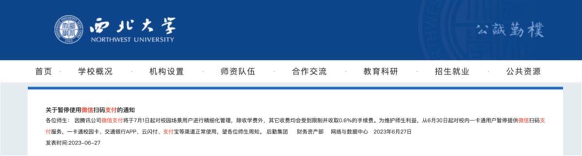 西北大学暂停使用微信支付的公告(该公告现已撤下)