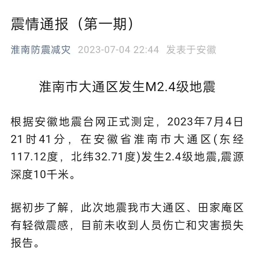 据淮南防震减灾微信公众号:根据安徽地震台网正式测定,2023年7月4日21时41分,在安徽省淮南市大通区(东经117.12度,北纬32.71度)发生2.4级地震,震源深度10千米。