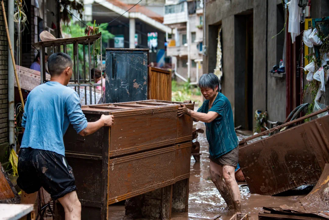 7月4日,重庆万州区五桥河河水上涨至历史最高水位。图为洪水消退后,受灾群众抢救生产生活物资。来源:“微万州”微信公号