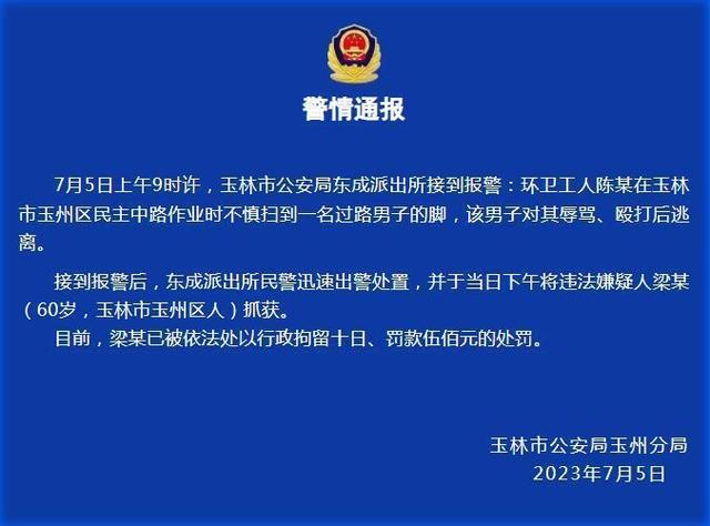 7月5日上午9时许,玉林市公安局东成派出所接到报警:环卫工人陈某在玉林市玉州区民主中路作业时不慎扫到一名过路男子的脚,该男子对其辱骂、殴打后逃离。