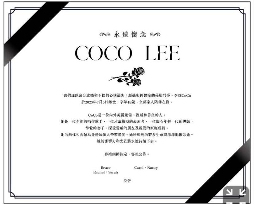 7月6日,李玟老公Bruce与李玟两位家姐一同发出讣告,文中提到:“我们谨以万分悲痛和不舍的心情通告:经过与抑郁症的长期斗争,李玟CoCo于2023年7月5日离世,享年48岁,全部家人陪伴在侧。CoCo是一位内外美丽兼备,温暖和善良的人。她是一位全能的唱作歌手,一位才华洋溢的表演者,一位关心年轻一代的导师,挚爱的妻子、深受爱戴的朋友及亲爱的家庭成员。她的热忱和真诚为身边每个人带来阳光。她所触动的许多生命将深深地怀念她。她的影响力和光芒将永远持续下去。葬礼细节待定,容后公布。”