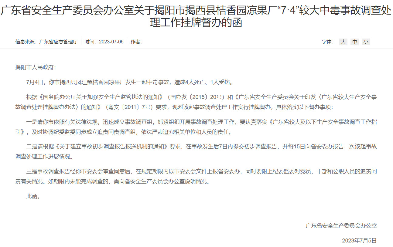 7月6日,广东省应急管理厅在其官方网站发布《广东省安全生产委员会办公室关于揭阳市揭西县桔香园凉果厂“7·4”较大中毒事故调查处理工作挂牌督办的函》。函文全文如下: