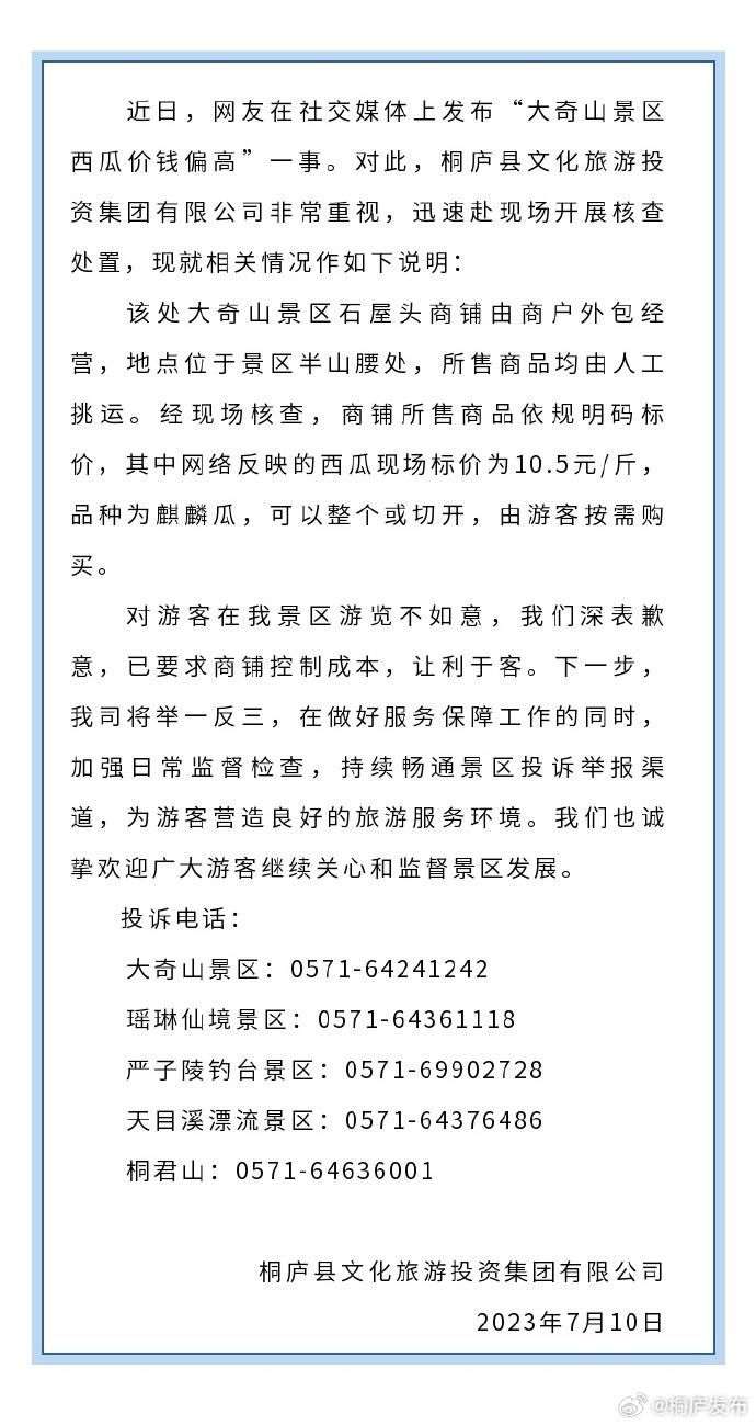 据浙江省杭州市桐庐县人民政府新闻办公室官方微博:7月10日,桐庐县文化旅游投资集团有限公司发布情况说明,近日,网友在社交媒体上发布“大奇山景区西瓜价钱偏高”一事。对此,桐庐县文化旅游投资集团有限公司非常重视,迅速赴现场开展核查处置,现就相关情况作如下说明: