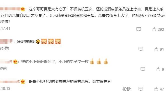 不少网友看到这个视频后评论道:“这个哥哥真是太有心了!有哥的妹妹像块宝……”“好宠妹妹呀!”