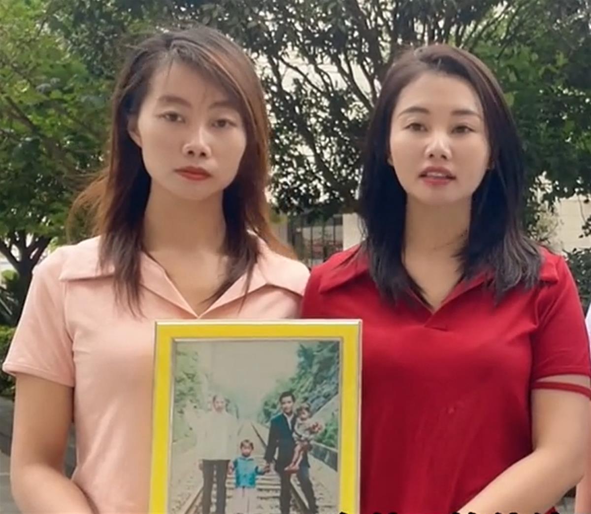 杨妞花(右)和姐姐捧着幼时全家福参加庭审 (视频截图)