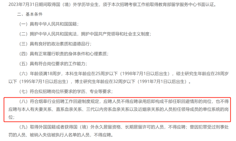 BRTV北京时间进一步发现,该回避要求并非今年首次出现,以山东烟草局为例,该公司2022年高校毕业生招聘公告就要求应聘者符合烟草行业招聘工作回避制度规定,应聘人员不得应聘录用后即构成干部任职回避情形的岗位,也不得应聘与本人有夫妻关系、直系血亲关系、三代以内旁系血亲关系以及近姻亲关系的人员担任领导成员的单位系统的岗位。