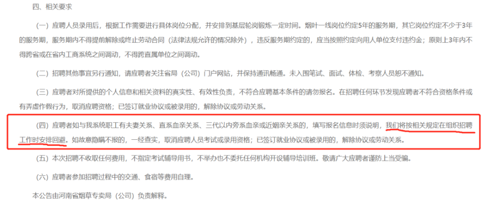 河南省烟草专卖局也提出了任职回避要求,不过在其相关要求中提到:应聘者如与我系统职工有夫妻关系、直系血亲关系、三代以内旁系血亲或近姻亲关系的,填写报名信息时须说明,我们将按相关规定在组织招聘工作时安排回避。