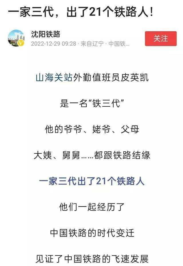 沈阳铁路去年底发布一条“一家三代出了21个铁路人”的文章,说某某是一名“铁三代”,他的爷爷、姥爷、父母、大姨、舅舅都跟铁路结缘,一家三代一共出了21个铁路人,他们经历了中国铁路的时代变迁,见证了中国铁路的飞速发展。同样令网友反感。