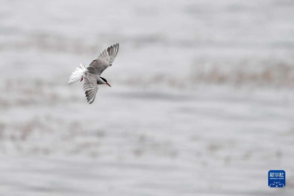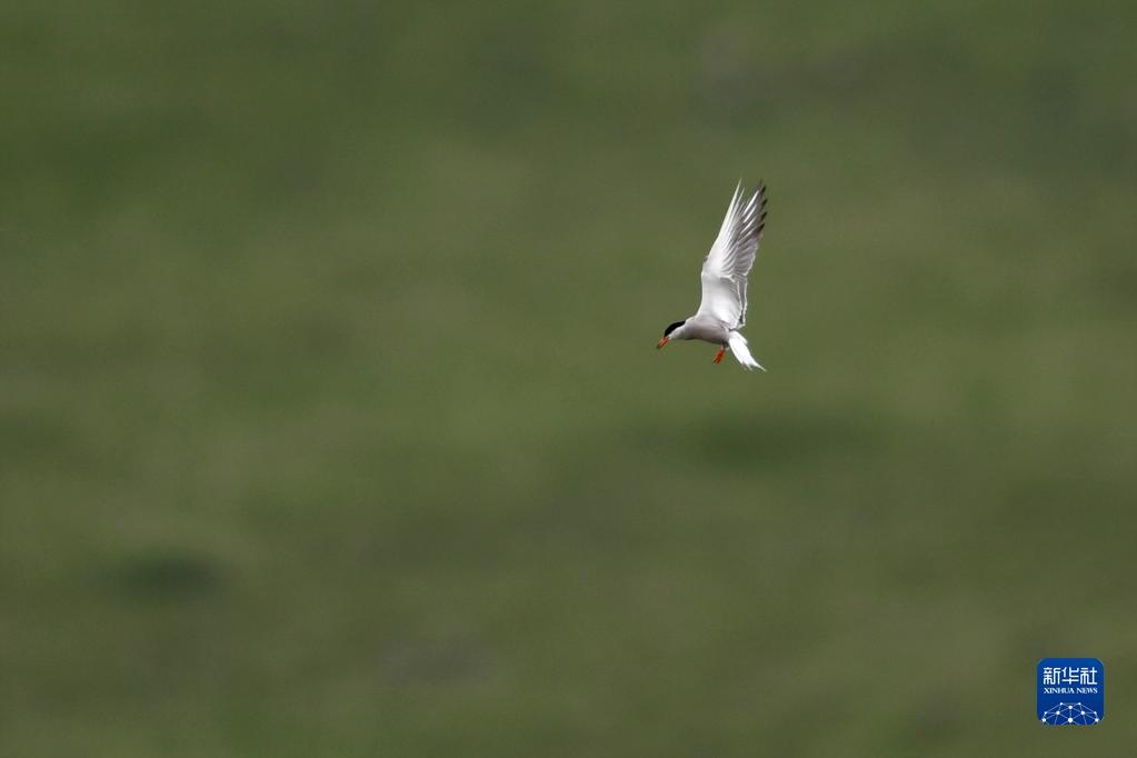 一只燕鸥在尕海湿地上飞翔(7月7日摄)。