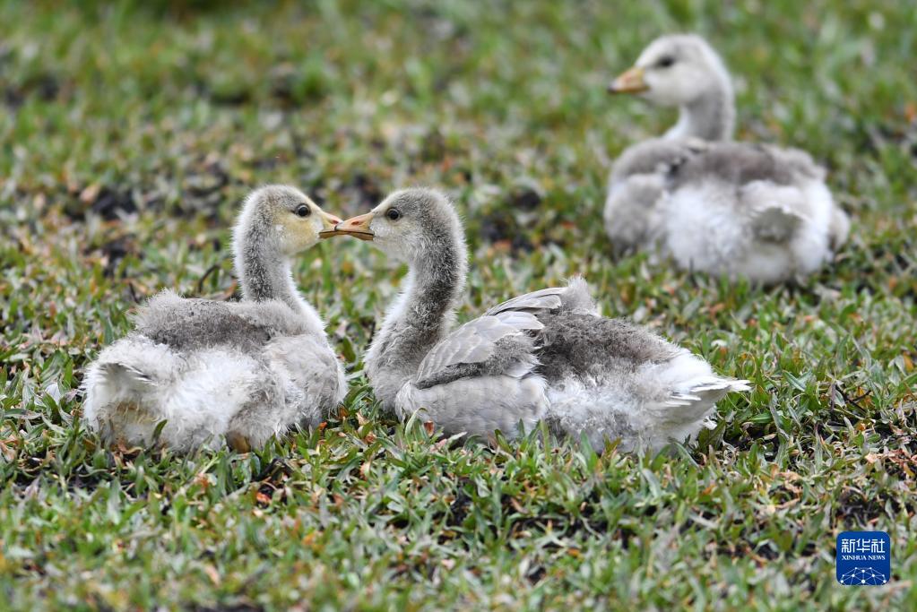 斑头雁幼鸟在尕海湿地嬉戏(7月7日摄)。