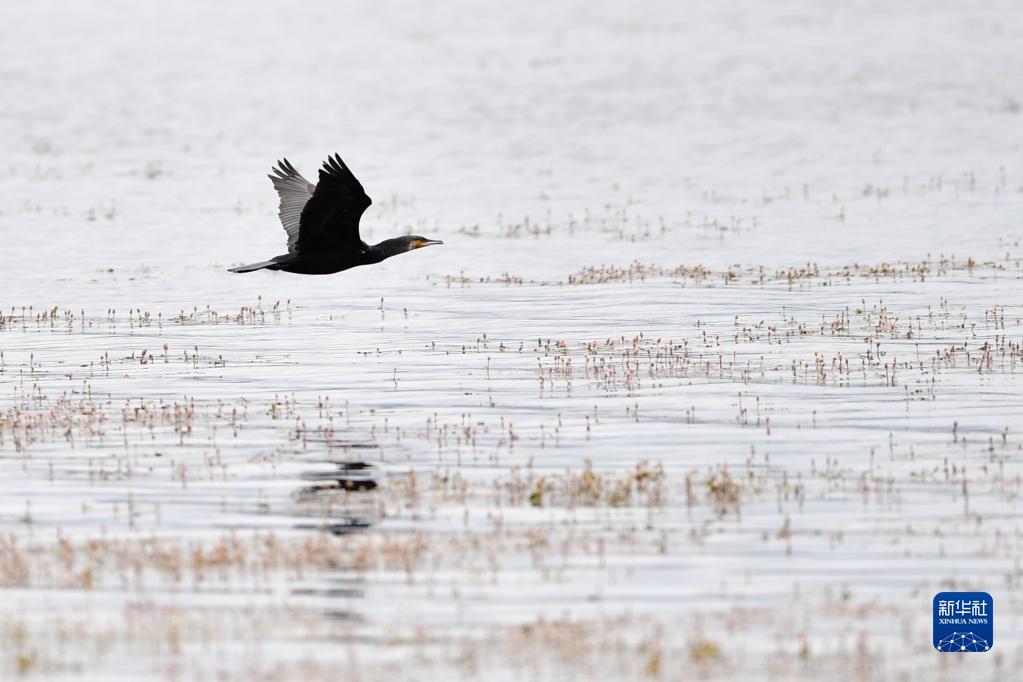 一只鸬鹚在尕海湿地上飞翔(7月7日摄)。