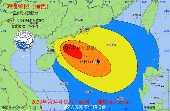 7月16日16时,自然资源部南海预报减灾中心发布海浪橙色警报以及风暴潮黄色警报,提醒受影响海域作业船只及有关部门做好防浪避浪措施。