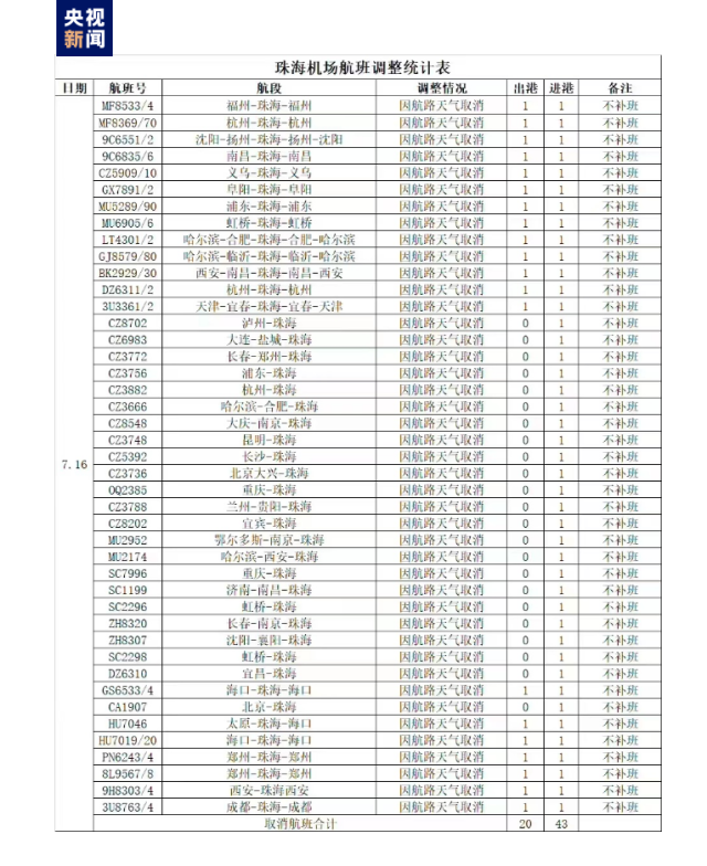 记者了解到,截至16日17时,珠海金湾机场取消16日进港航班43班,出港航班20班。广州白云国际机场截至16日17时暂未有航班取消,后续将视天气情况动态调整。