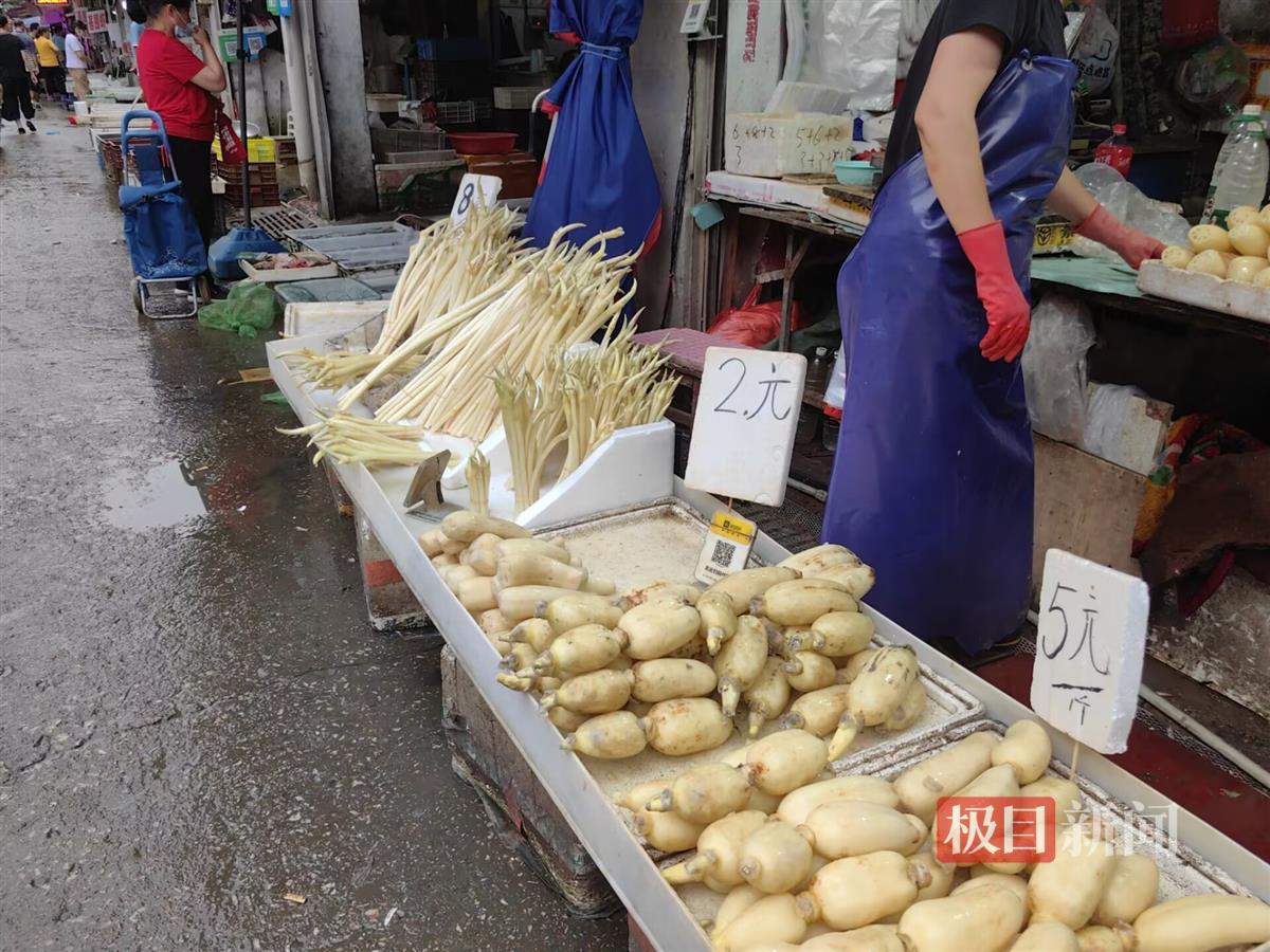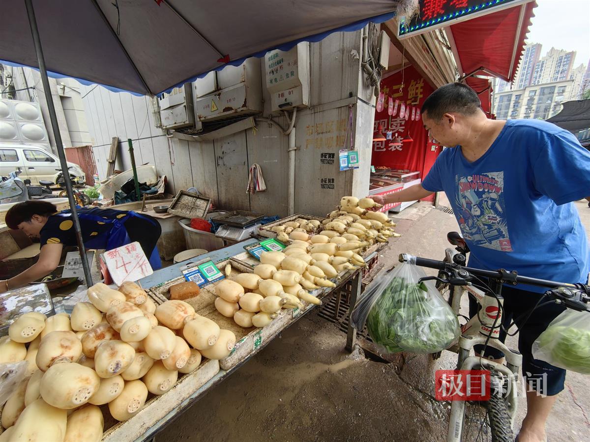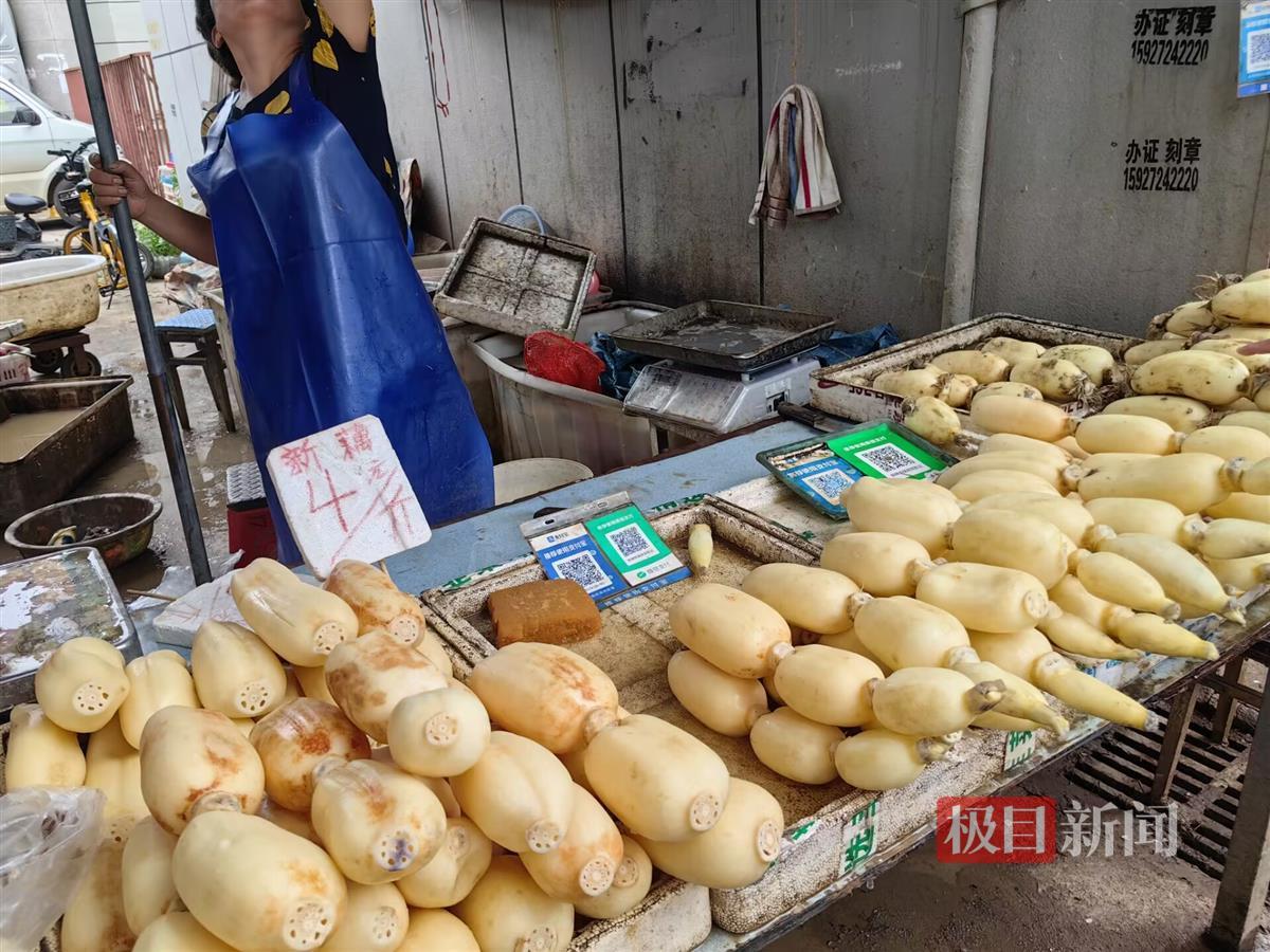 7月17日一早,武汉汉口姑嫂树路上的一座蔬菜大市场里,两家主营莲藕的摊位在一排卖绿色蔬菜的“队列”中显得特别清新。几位市民正挑选着摊位上的嫩藕,一节节看起来分外清爽。