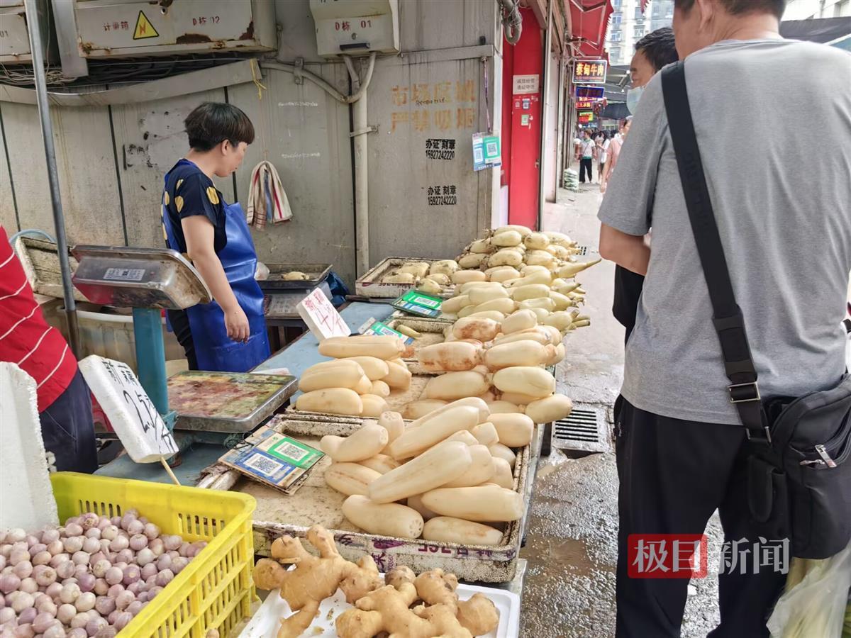 一位市民挑选了三节5元一斤的莲藕,称重以后是7.2元。“家里老人喜欢吃脆藕,这段时间几乎每天都要吃两节,凉拌着加点糖来吃,口感非常清爽。”
