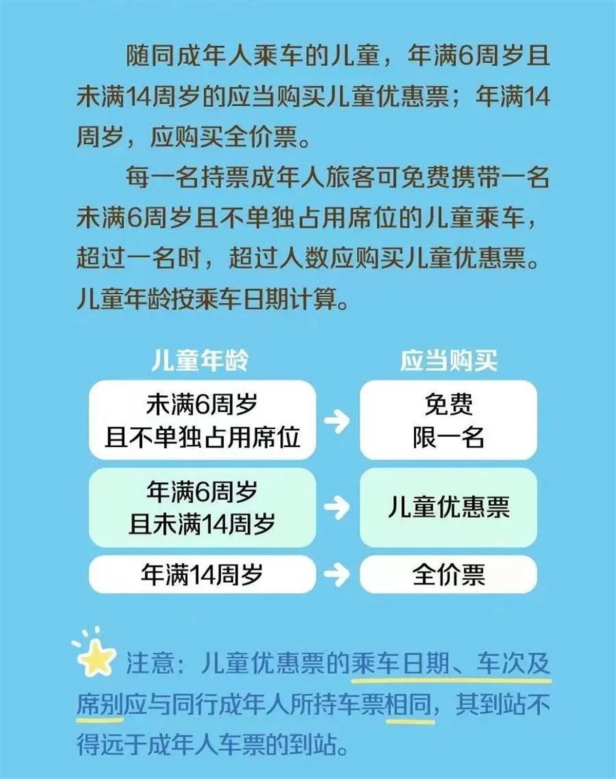 根据今年1月1日起施行的《铁路旅客运输规程》,随同成年人乘车的儿童,年满6周岁且未满14周岁的应当购买儿童优惠票,年满14周岁的应当购买全价票。每一名持票成年人旅客可免费携带一名未满6周岁且不单独占用席位的儿童乘车,超过一名时,超过人数应当购买儿童优惠票。儿童年龄按乘车日期计算。