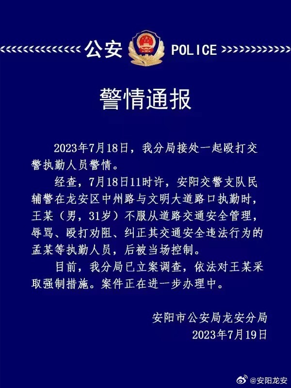 经查,7月18日11时许,安阳交警支队民辅警在龙安区中州路与文明大道路口执勤时,王某(男,31岁) 不服从道路交通安全管理辱骂、殴打劝阻、纠正其交通安全违法行为的孟某等执勤人员,后被当场控制。