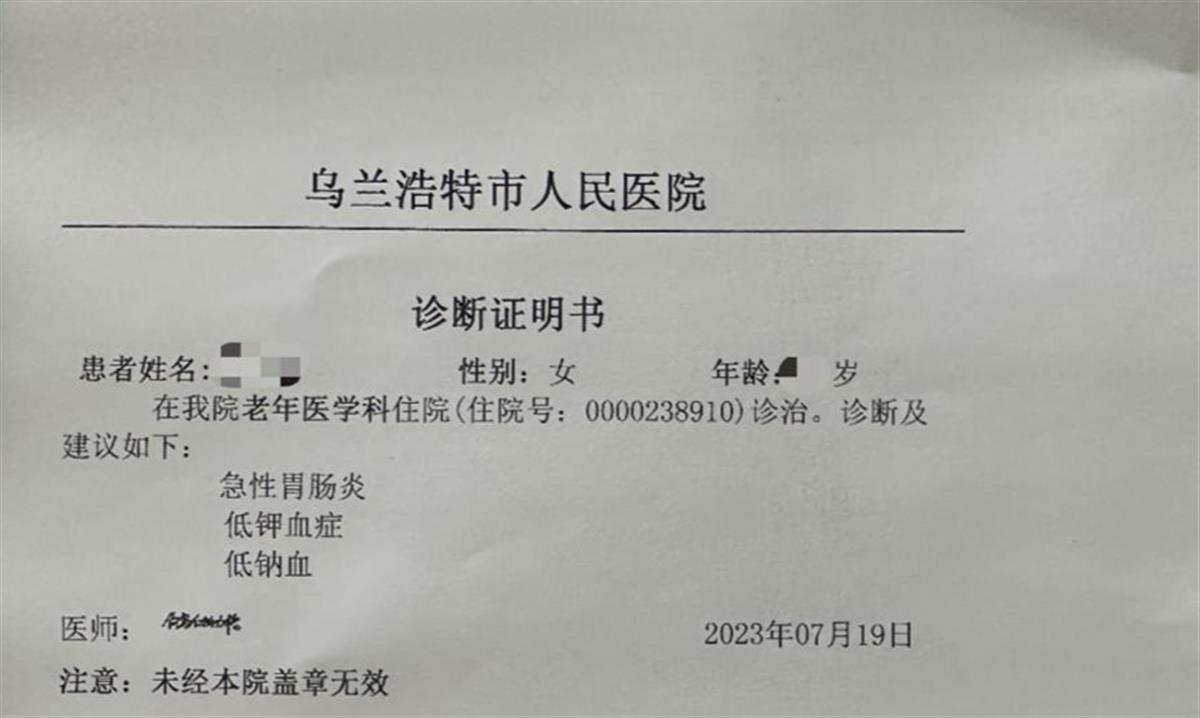 据刘女士提供的三张医院开具的诊断证明书显示,医生给她和父母三人的诊断建议均为急性肠胃炎、低钾血症和低钠血症。