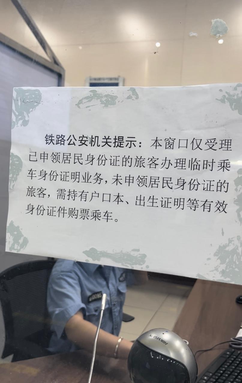 记者在人工窗口旁边见到,还有一台“身份证自助补办机”,几乎没有人排队,偶尔有一两个成年旅客在此补办临时身份证明。在“公安制证窗口”,记者询问了一下工作人员,工作人员说因为是暑运高峰期,最近每天来窗口补办临时身份证明的儿童、青少年约有三四百人,在她的办公桌上有一沓厚厚的办理记录小票。在窗口上还贴着一张提示,这个窗口只办理已经申领居民身份证的旅客办理临时身份证明。