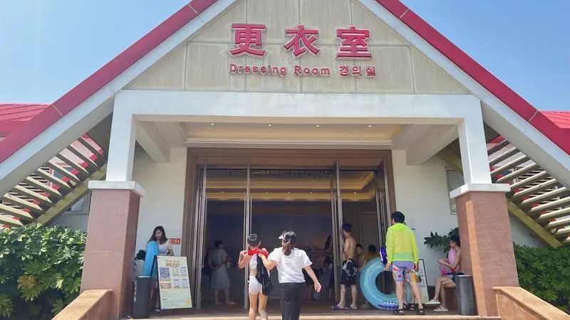 周先生介绍,景区有露天淋浴设施和室内淋浴设施。露天淋浴为脚踏板式,方便游客在玩水过程中就近简单冲洗,不过没有任何遮阳措施,顶着大太阳淋浴有点难受。室内淋浴在更衣室,和储物柜在一起。等到傍晚时分,游客们玩水结束后,陆续走向更衣室准备淋浴更衣后回家。
