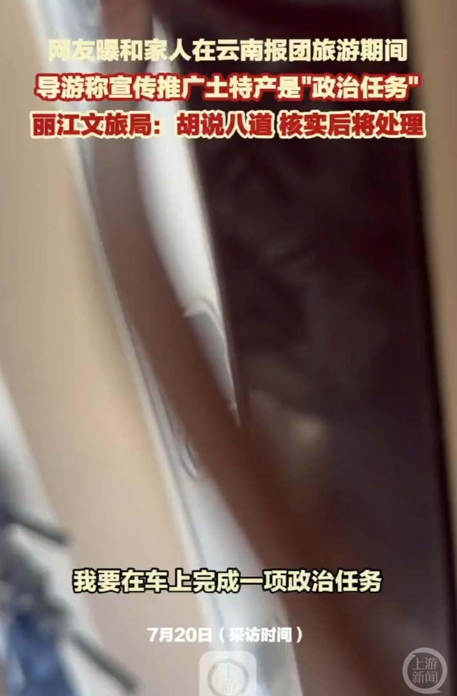 针对导游称宣传推广土特产是“政治任务”一事,7月21日下午,云南丽江市文旅局工作人员告诉上游新闻(报料邮箱:cnshangyou@163.com)记者称,目前旅游执法支队正进行调查,之后将根据调查情况决定是否立案,以及作出相应行政处罚。