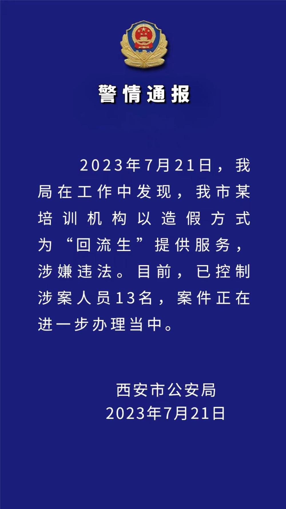 7月21日晚,西安市公安局发布警情通报,称发现该市某培训机构以造假方式为“回流生”提供服务,涉嫌违法。目前,已控制涉案人员13名,案件正在进一步办理当中。
