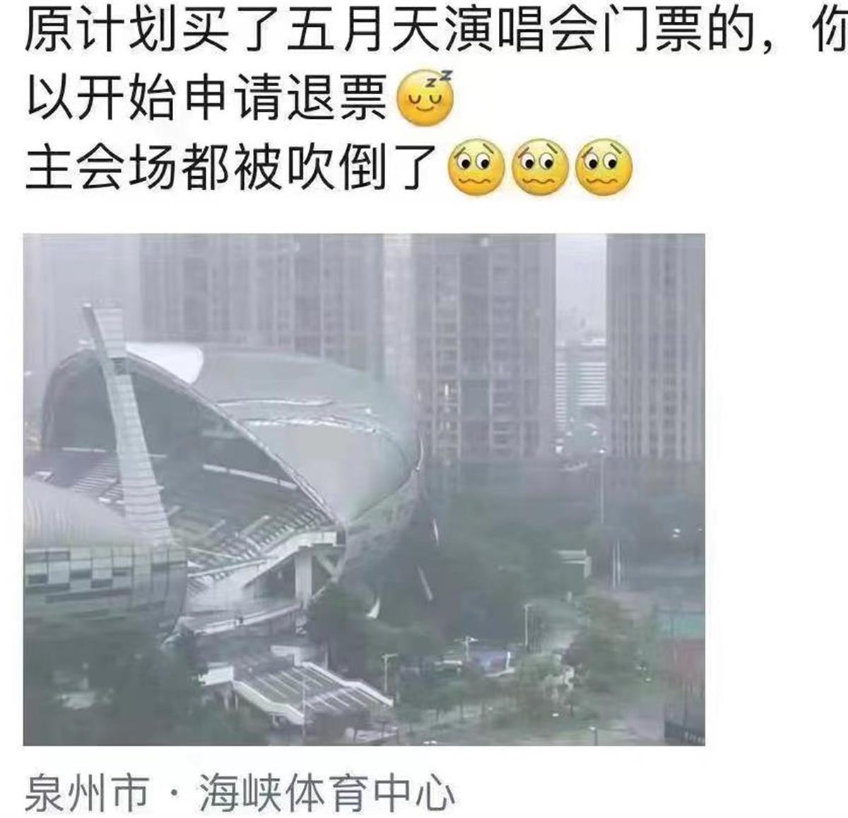 网友发布的视频中,大风肆虐,一体育场顶棚疑似有大型的缺口,还有顶部部分表皮随风飘舞。有网友在朋友圈配发文图称,“原计划买了五月天演唱会门票的,可以开始申请退票了,主会场都被吹倒了”。