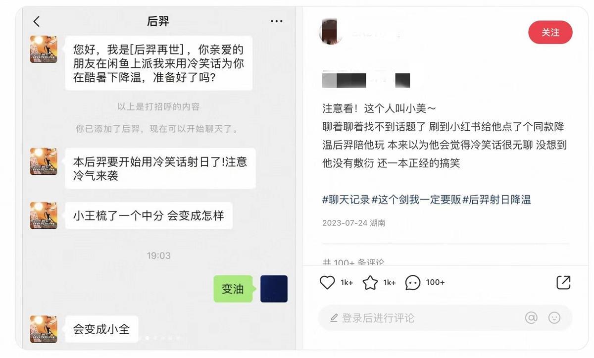 “和朋友聊着聊着找不到话题了,给他点了个同款降温‘后羿’陪他玩。”湖南一位网友在小红书的发文,十分幽默。她还表示:虽然天气热得让人烦躁,但是“后羿”一口气讲了20多个冷笑话,还是有被快乐到!