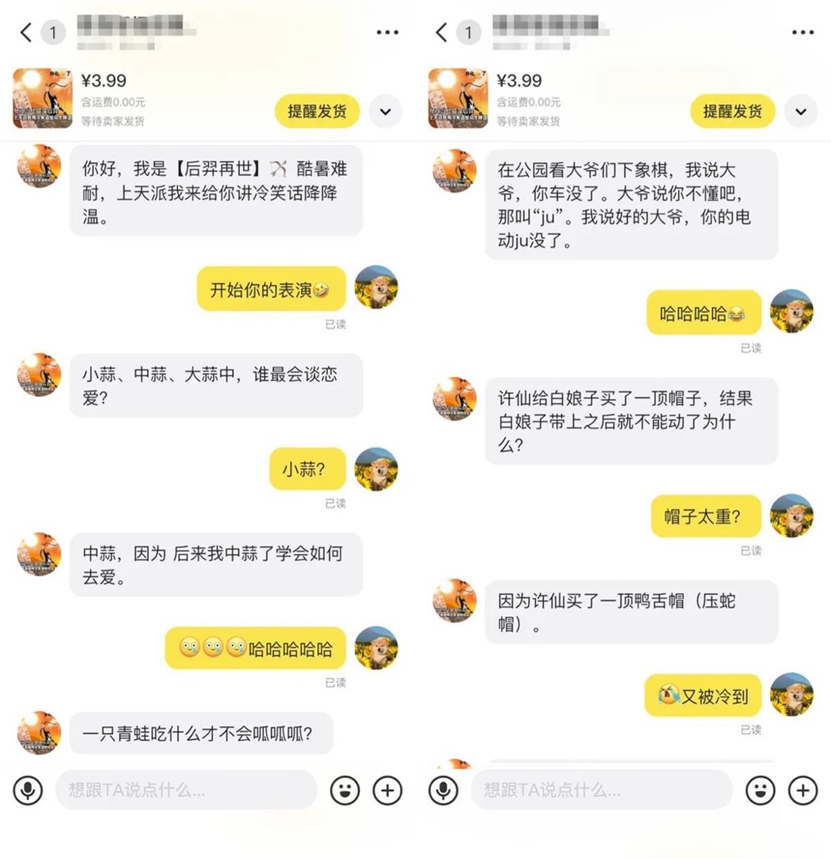 据悉,“冷笑话后羿”的起源是,网友在豆瓣中发文称其为冷笑话的重度爱好者,灵光一闪决定在暑期假扮成网络后羿的身份来给大家讲冷笑话降温,一经发布后就有不少人咨询并主动下单“求冷”,被调侃为商业奇才。