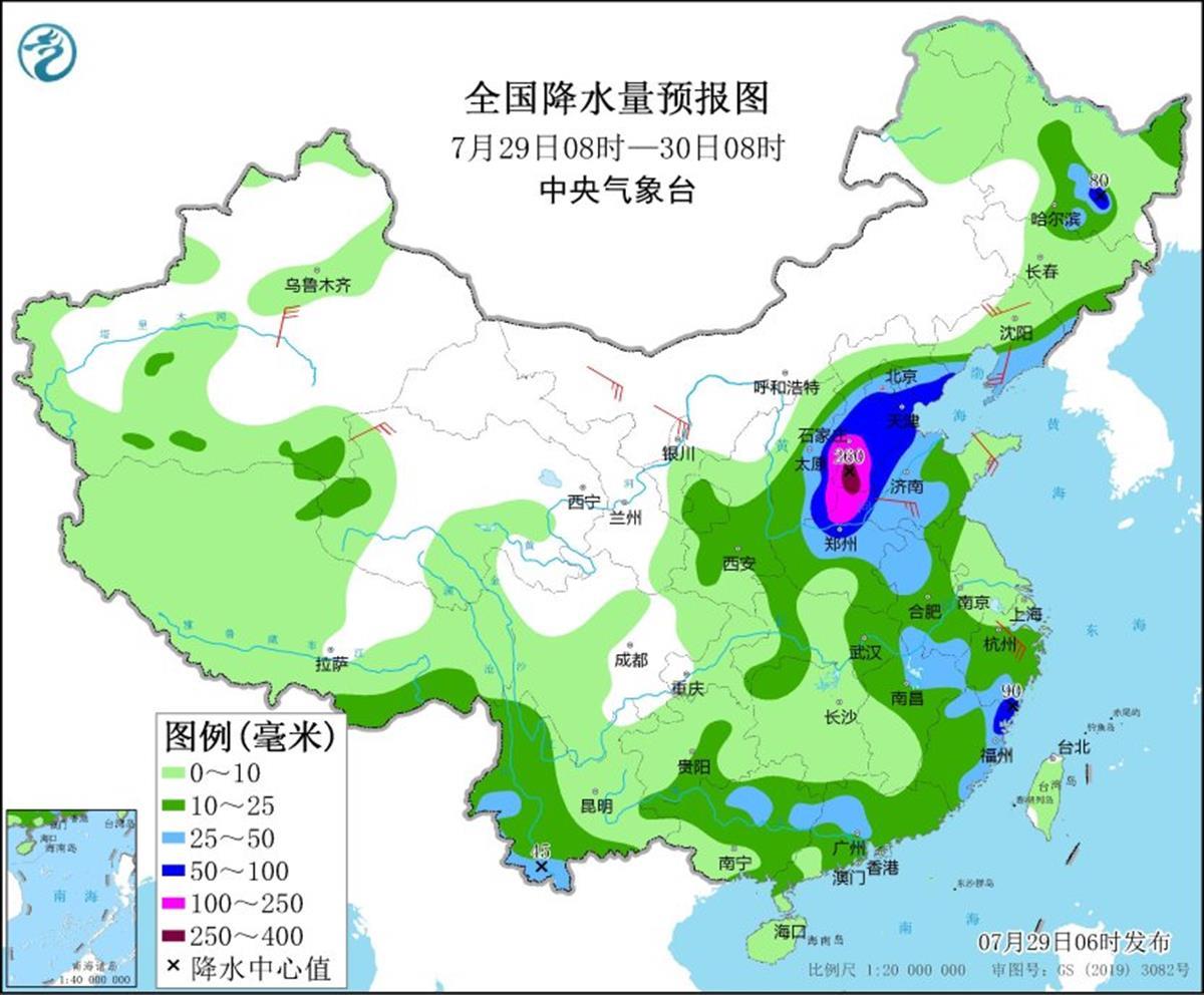 其中,今天(29日)白天至夜间,河北大部、北京、天津、山东中西部、河南中北部、辽宁东部以及黑龙江中南部、安徽北部和西南部、江西东北部、浙江南部、福建东部、云南西南部等地部分地区有大到暴雨,河北南部、河南北部、山西东南部等地部分地区有大暴雨,河北南部等地局地特大暴雨(250毫米-260毫米)。上述部分地区伴有短时强降水,黑龙江中部、吉林西北部、山东中西部、河南东北部、江苏、上海、浙江北部和东部等地的部分地区将有8级-10级雷暴大风天气,局地可达11级以上。