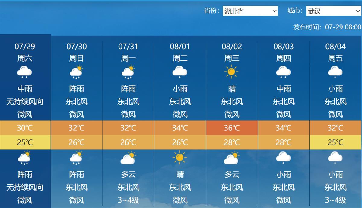 周日和下周一,武汉天气是复制粘贴似的一样一样的:多云有小到中阵雨或雷阵雨,气温26℃-34℃,偏北风停转,转为偏南风送湿热。