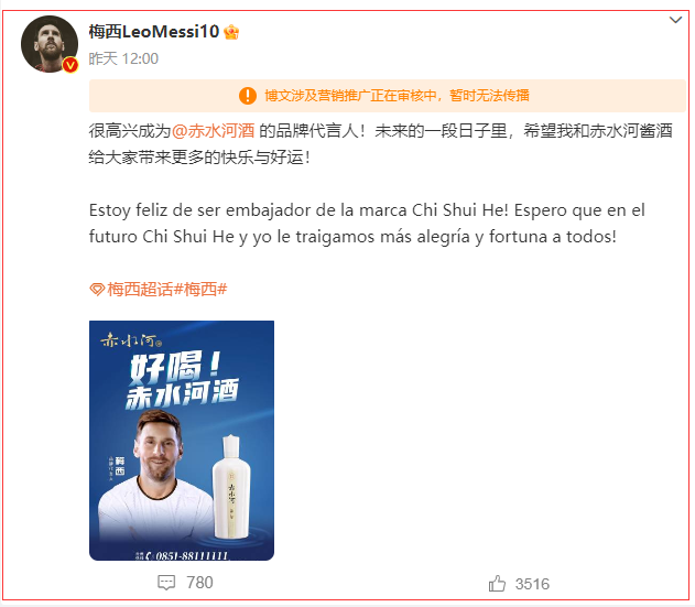 8月2日16时许,红星新闻记者发现,梅西8月1日在社交平台发消息称,很高兴成为@赤水河酒的品牌代言人!未来的一段日子里,希望我和赤水河酱酒给大家带来更多的快乐与好运!不过,被标注“博文涉及营销推广正在审核中,暂时无法传播。”