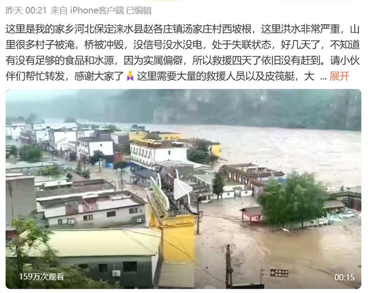 另一名网友发布求助称,河北省涞水县赵各庄镇、龙门乡、其中口乡、三坡镇等地各个村庄受洪灾影响严重。