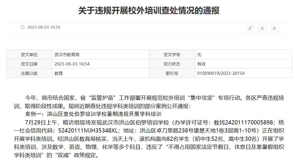 案例一:洪山区查处伯罗培训学校暑期违规开展学科培训