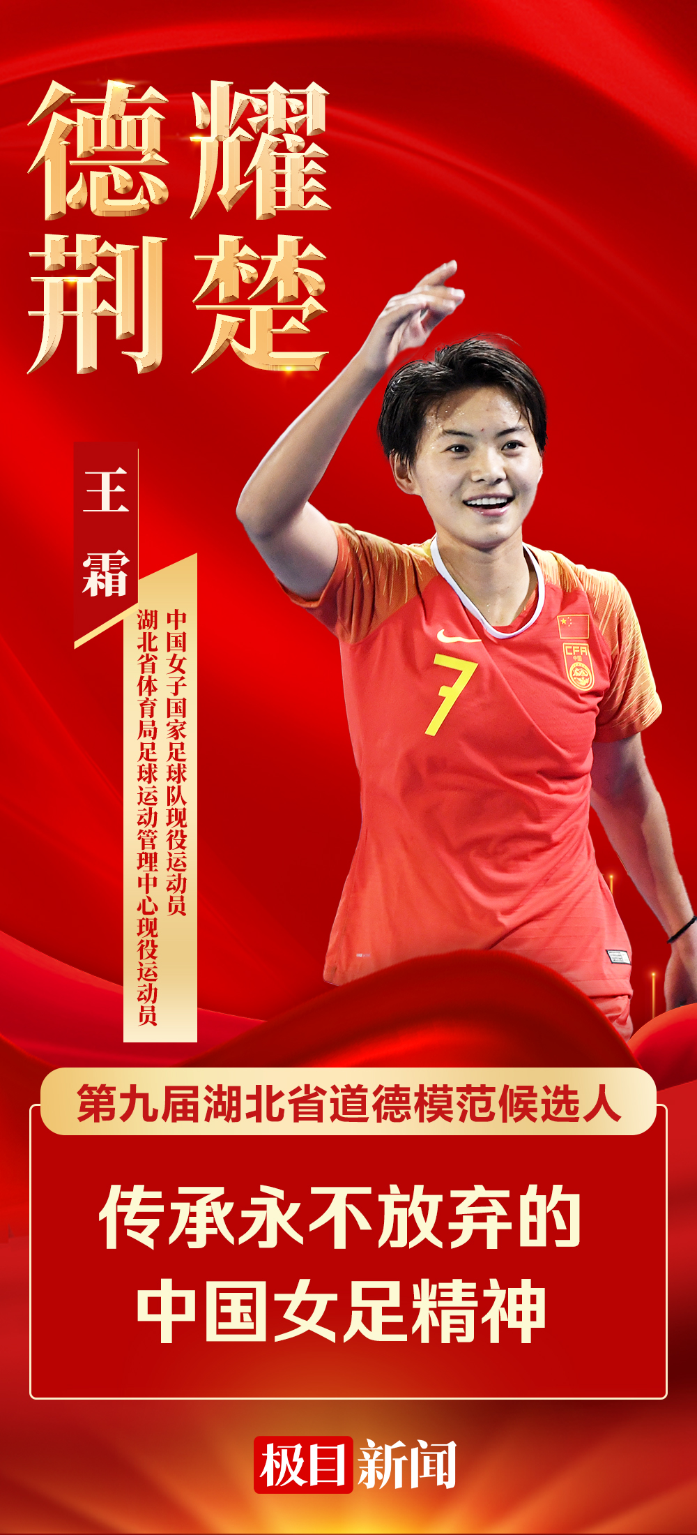 今年,是第九届湖北省道德模范评选表彰年。近日,经湖北省委宣传部、省文明办、省总工会、团省委、省妇联、省人社厅六个部门联合评选,第九届湖北省道德模范候选人名单发布。湖北省体育局足球运动管理中心现役运动员、中国女子国家足球队现役运动员王霜在候选名单之列。
