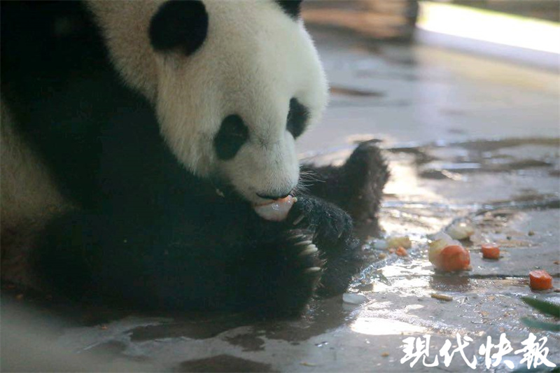 现代快报讯(通讯员江胜男记者顾潇)戏水纳凉、淋水喷雾、投喂果味冰块……面对夏日“烤”验,扬州茱萸湾动物园针对动物不同的习性,采取“花式”消暑降温方式,帮助动物度过炎炎夏日。8月5日上午9时,现代快报记者跟随工作人员来到熊猫馆,大熊猫“捞捞”和“月亮”正舒服地待在空调房内,开启了欢乐“躺吃懒睡”的避暑模式。记者看到,饲养员为大熊猫准备了它们喜欢吃的新鲜竹笋、竹子,并用果味冰块进行投喂。