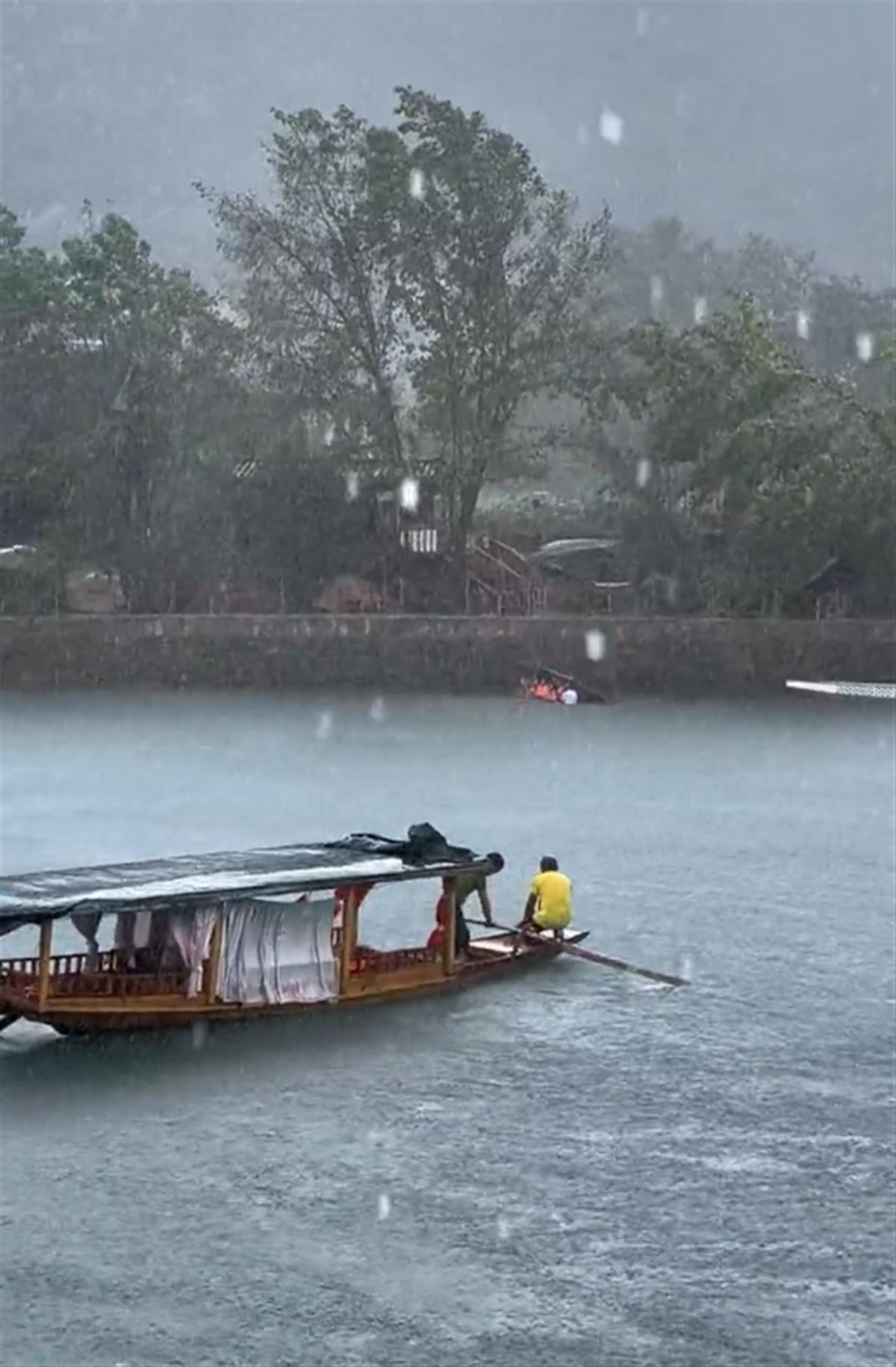 据网友拍摄的视频,在江面上,一艘载有游客的游船在江对岸进水下沉,两名男子冒着暴风雨奋力划船横渡百米江面。视频中暴风雨异常猛烈,江面波涛汹涌,前去营救的木船船身不稳,但两名男子奋力划向了涉险船只,游客们被一个一个拉上了救援的木船,成功脱险。