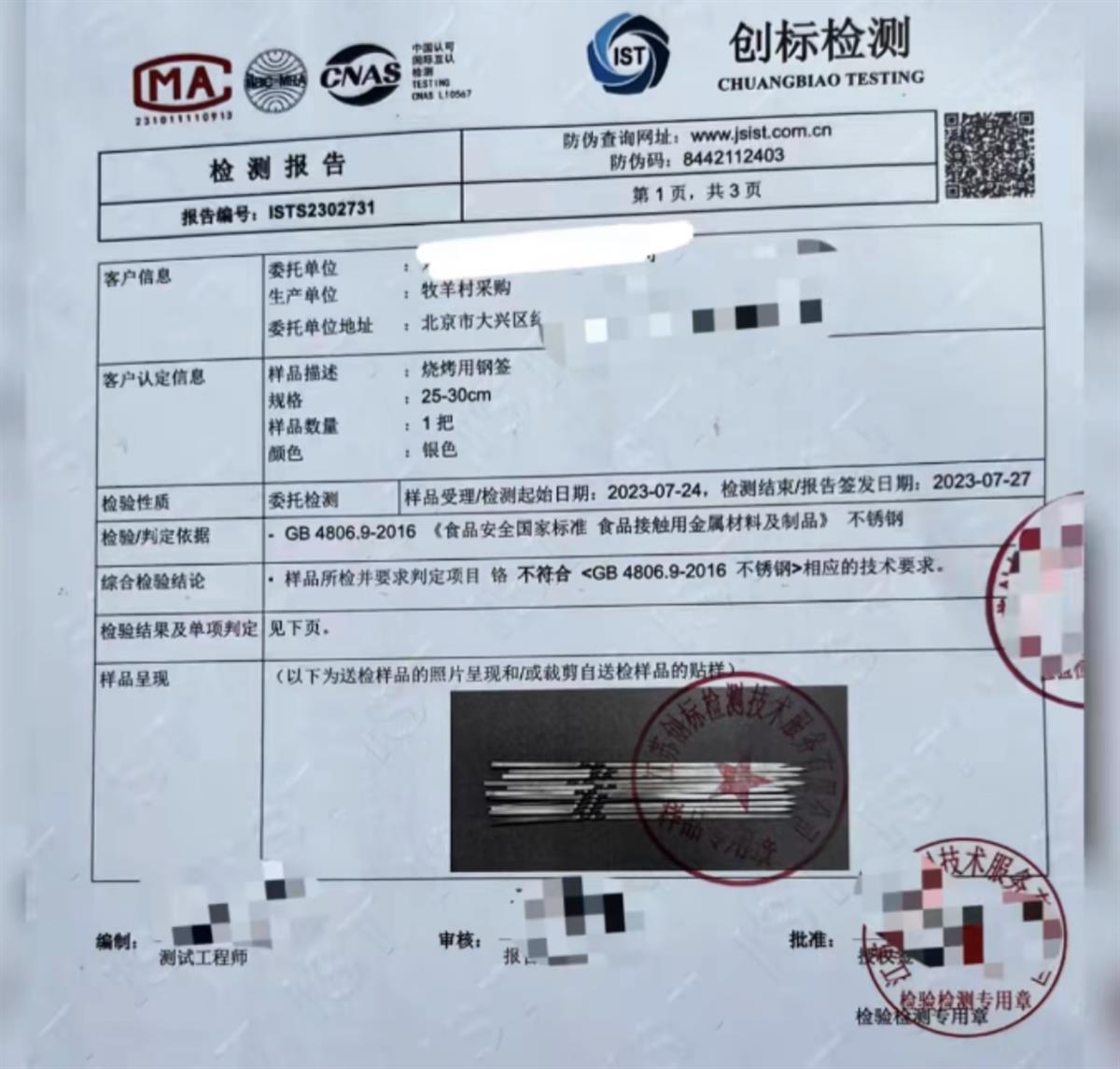 8月11日,知名打假人王海在其社交平台上发布了多条视频,称淄博三十年老店牧羊村烧烤使用非食品级不锈钢签,经检测确认重金属超标,不符合食品安全标准。其出示的检测报告显示,不符合GB4806.9-2016不锈钢相应的技术要求。判定依据为GB4806.9-2016《食品安全国家标准 食品接触用金属材料及制品》不锈钢。